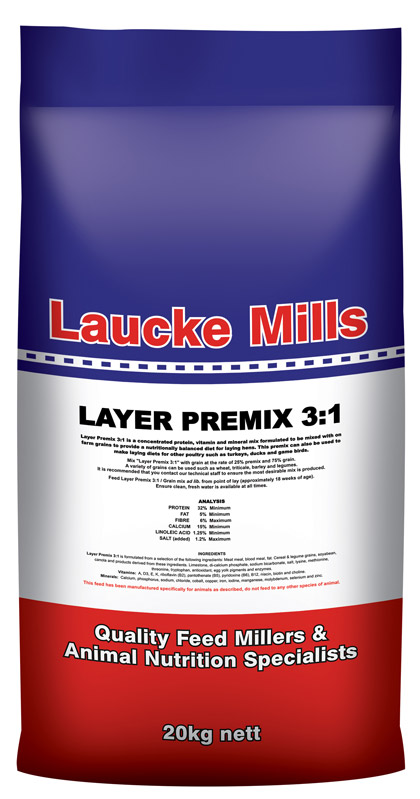 Layer Premix 3:1 is formulated from a selection of the following ingredients: Meatmeal, blood meal, fat. Cereal & legume grains, soyabean, canola and products derived from these ingredients. Limestone, di-calcium phosphate, sodium bicarbonate, potassium carbonate, salt, lysine, methionine, threonine, tryptophan, isoleucine, valine, antioxidant, natural egg yolk pigments and enzymes.