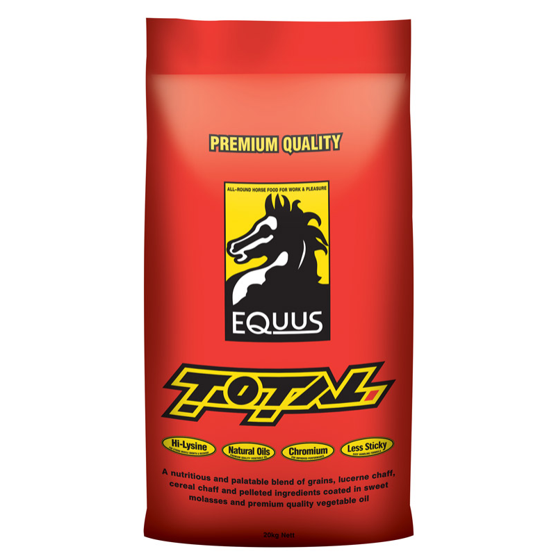 Equus Total is a blend of grains, lucerne chaff, cereal chaff and pelleted ingredients coated in sweet molasses and vegetable oil.